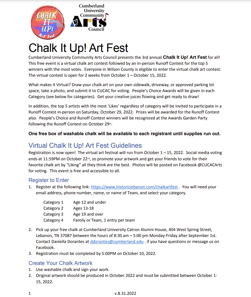 Cumberland University Community Arts Council presents the 3rd annual Chalk It Up! Art Fest for all! This free event is a virtual chalk art contest followed by an in-person Runoff Contest for the top 5 winners with the most votes. Everyone in Wilson County is eligible to enter the virtual chalk art contest. The virtual contest is open for 2 weeks from October 1 – October 15, 2022.